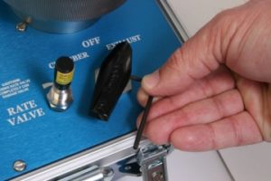 4. Rotate wrench clockwise until the gas leak can no longer be heard. Remove wrench and reinstall the black handle. Note: If the instrument is used over a wide range of temperatures, some adjustment may be needed due to thermal expansion within the valve; this is normal.
