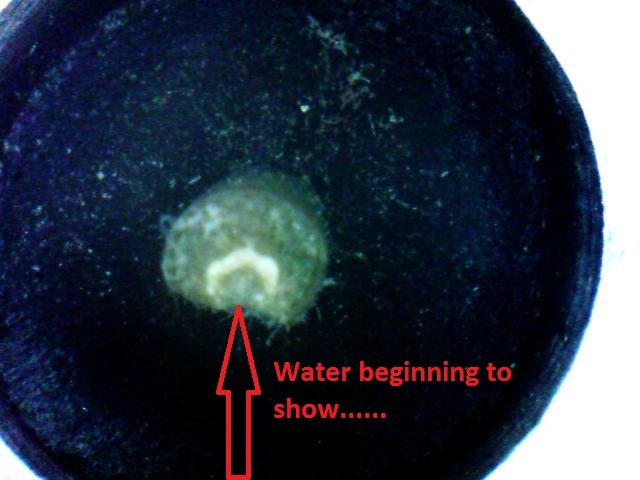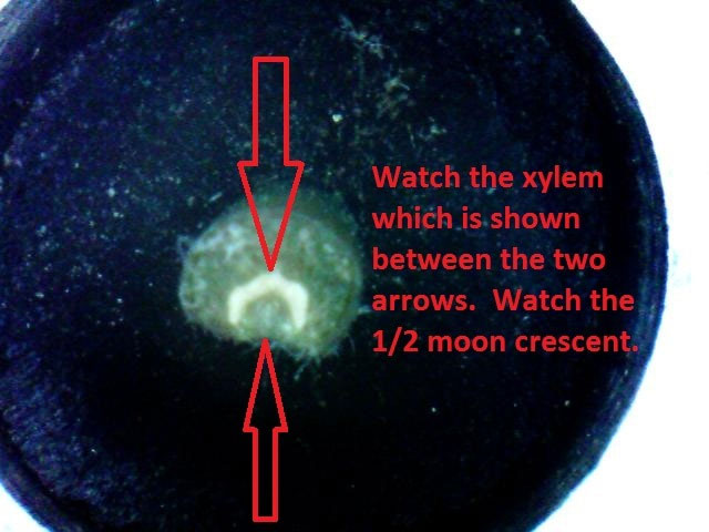 Focus on the 1/2 moon crescent. This is the area where the xylem comes to the surface and where you want to watch for water to appear.