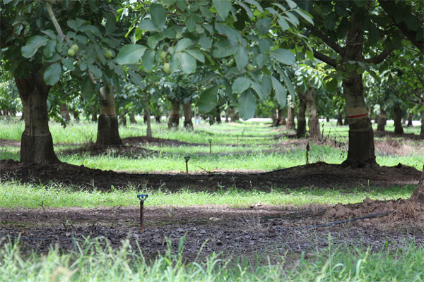 The tree should be at least 3-4 rows from the outside of the orchard. This will ensure a good representative of the irrigation block. Trees on the edge of the orchard normally have additional stress on them due to more exposed canopy.