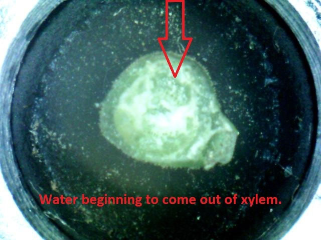 This is a close-up look at the cut end of the petiole. It is a 50X view with an electronic microscope. Watch the inner 80% of the petiole as this is where the xylem cells are located on walnut. Look for water to begin coming to the cut surface. There will be a change of color in the xylem from light green to dark green.