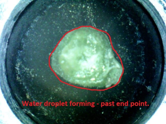 This is the “official” end-point for the measurement. When water is seen coming up, there will be a change in color and water will flow. You should immediately shut off the Control Valve at this moment. This is the official end point.