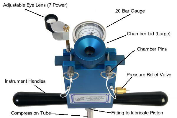 The Pump-Up Pressure Chamber is different from the conventional gas chamber in that it does not require a source of compressed gas. The instrument produces pressure in the chamber required to take water potential readings by pumping it as shown below. The relatively small chamber allows the user to achieve about one half Bar (7.25 psi) pressure per stroke. The instrument is limited to 20 Bar and is designed primarily for irrigation scheduling/monitoring, particularly for managing deficit irrigation.
